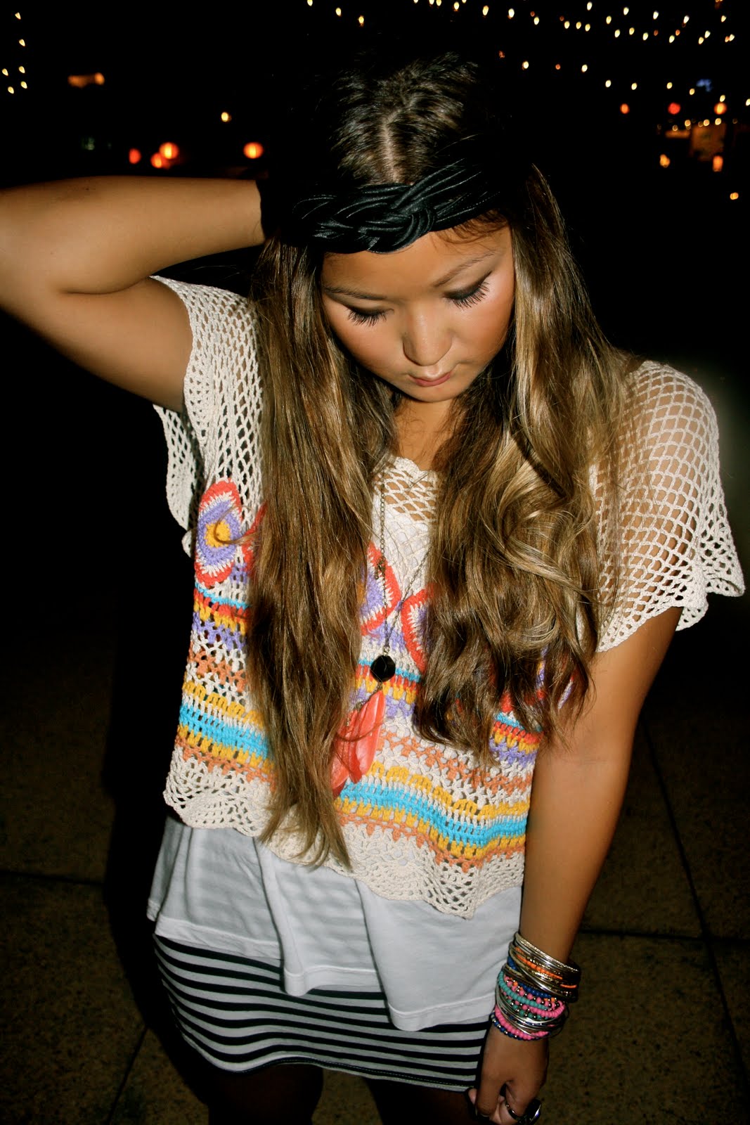 thrifted crochet top, Topshop tank and wedges, New Look skirt, H&M feather necklace and bracelets.